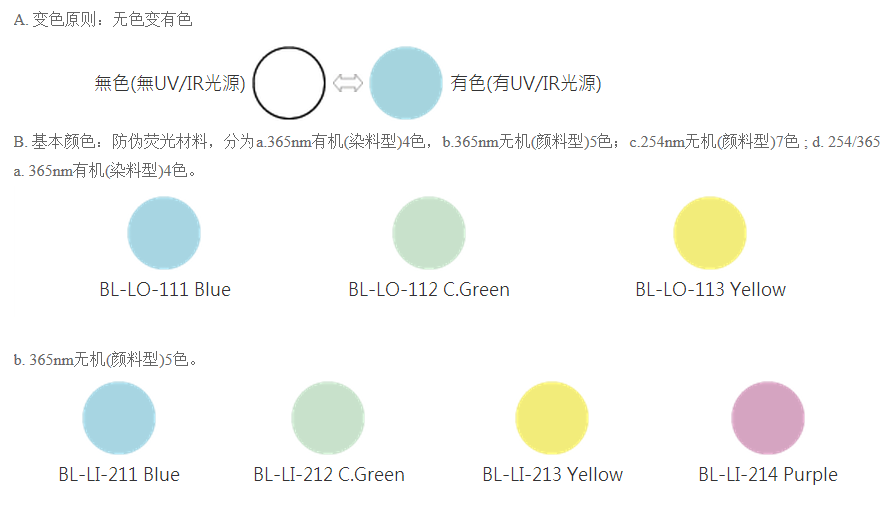 本系列產(chǎn)品特殊熒光體在可見光光源下,呈現(xiàn)白色或接近透明色,在不同波長(zhǎng)光源下(254nm、 365 nm、 850 nm) 顯現(xiàn)一種或多種熒光色澤,包括有機(jī)、 無(wú)機(jī)、余暉等特殊效果,色彩鮮艷亮麗,熒光標(biāo)識(shí)材料主要用于生產(chǎn)防偽油墨和標(biāo)志塑料。
